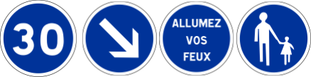 A l’instar des panneaux d’interdiction, ces plus simples panneaux d’obligation sont toujours de forme circulaire, mais cette fois de couleur bleue ou blanche. Le message est ici plus modéré, même s’il reste obligatoire. C’est le cas par exemple des panneaux de vitesse minimale obligatoire, ou d’obligation de contourner par la droite ou la gauche.