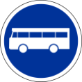 Le panneau qui suit est en revanche une exception à la norme qui veut qu'un panneau bleu circulaire soit une obligation : les véhicules de transports en commun ne sont pas obligés d'emprunter la voie qui leur est réservée, ils ont également le droit d'emprunter la voie générale. Le voici