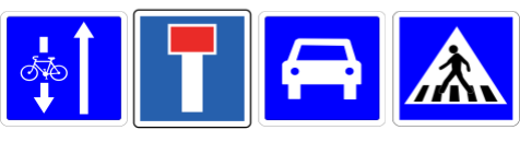 Ces panneaux sont de forme carrée et permettent aux usagers d’obtenir certaines informations à propos des usages de leur localisation. De couleur bleue ou blanche, les panneaux d’indication sont multiples. A titre d’exemple figurent les panneaux d’indication de vitesse conseillée ou encore d’impasses.
