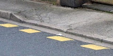 C’est un panneau circulaire rouge et bleu barré d’une seule ligne rouge, qui interdit les stationnements uniquement jusqu’à la prochaine intersection. La ligne jaune discontinue donne les mêmes informations au conducteur.